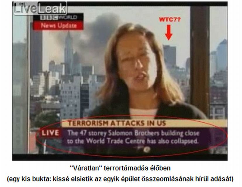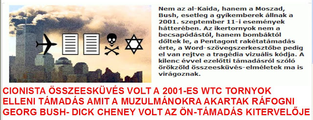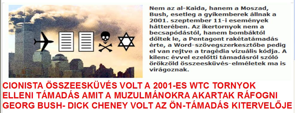 Mert Bin Laden-nek semmi köze az egészhez, úgy került a történetbe, mint Pilatus a credoba. Ez az égbekiáltó összeesküvés volt az alapja az afganisztáni és az iraki „szerepvállalásnak” is, és a terrorista-ellenes törvények, a civil lakosság kordában tartására hozott egyéb intézkedések meghozatalának. Mivel a rendelkezésre álló információk erősen indokolttá tesznek egy hivatalos és nemzetközi nyomozást, hogy kiderüljön a CIA-Mossad-zsidó világ és józan ész-ellenes összeesküvés minden részlete és a bűnösök mind az akasztófa árnyékában hűsölhessenek, mert tetteik következményeképpen már több millió embert írottak ki és tettek nincstelenné.