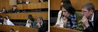 És mielőtt még valaki esetleg azt gondolná, hogy a felvétel egy pszichiátriai csoportterápián készült - ami valljuk meg, azért indokolt lenne mindkettőjük esetében -, azoknak jelezném, hogy szó nincs erről. A nagy találkozás tegnap a Pest Megyei Bíróságon, a cigánygyilkosságok tárgyalásán jött létre, ahol is Elqró, mint mezei érdeklődő jelent meg, Molnár F. pedig éppen a következő nagy leleplező videóját készítette.