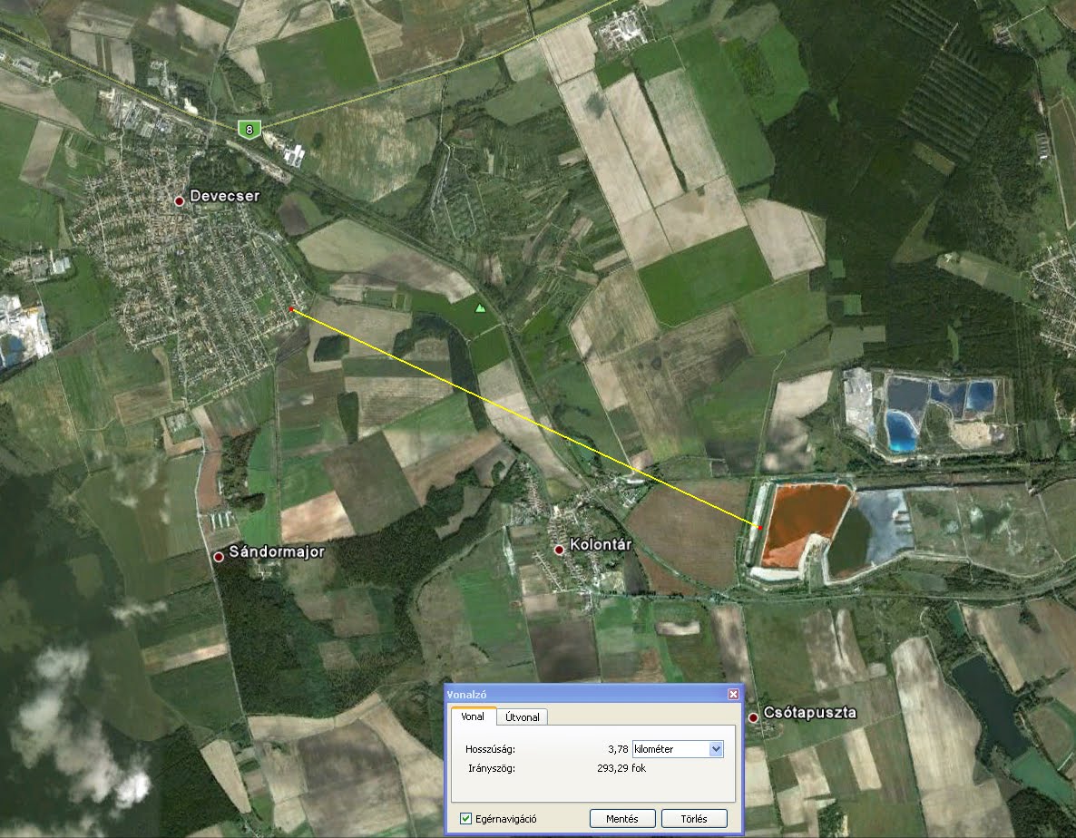 Jól szemlélteti a léptéket és a veszélyes anyag mennyiségét a legfelső képen sárga nyíllal jelölt munkagép, ami szinte eltörpül a gát mellett. De talán még ennél is megdöbbentőbb, hogyha megnézzük, hogy a tározó és Devecser milyen messze van egymástól. Az alábbi képen látható, hogy a távolság légvonalban cirka 4 kilométer. Milyen brutális mennyiség folyt ki, ha ekkora távolság után is még 1,5 méter magasan hömpölygött Devecser utcáin úgy, hogy előtte még letarolta Kolontárt?